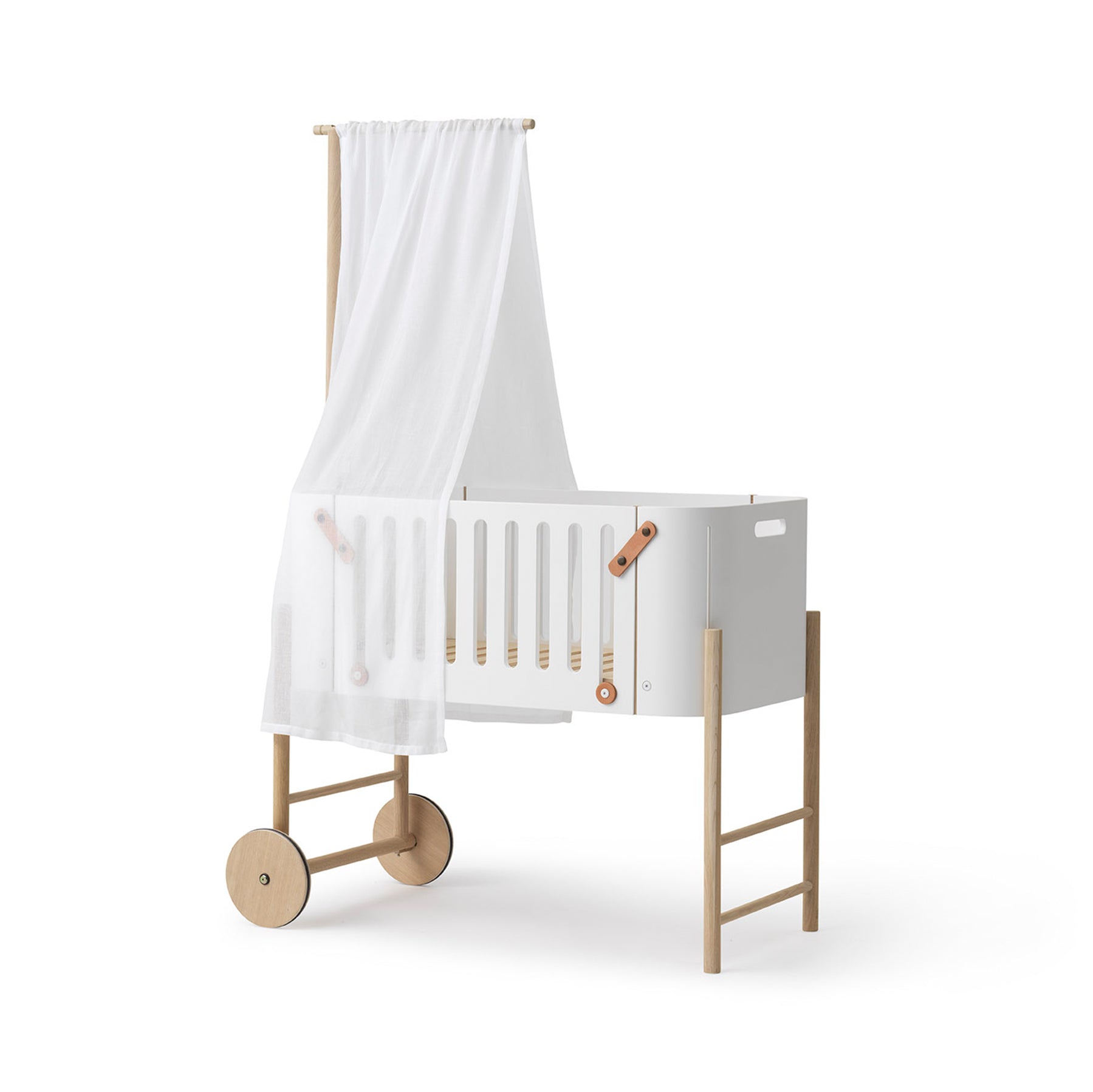 Um suporte de madeira em carvalho maciço possibilita a colocação de um dossel, protegendo das correntes e luzes, e ainda a colocação de um móbile para estimular os sentidos do seu bebé.
