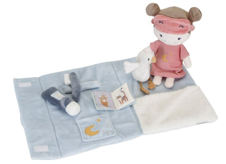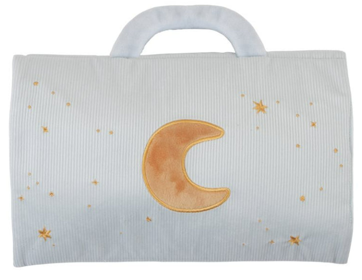 Este conjunto incentivará a muitas horas do jogo faz de conta. A mala azul transforma-se numa caminha e traz consigo os acessórios indispensáveis para imitar o ritual da hora de dormir.
