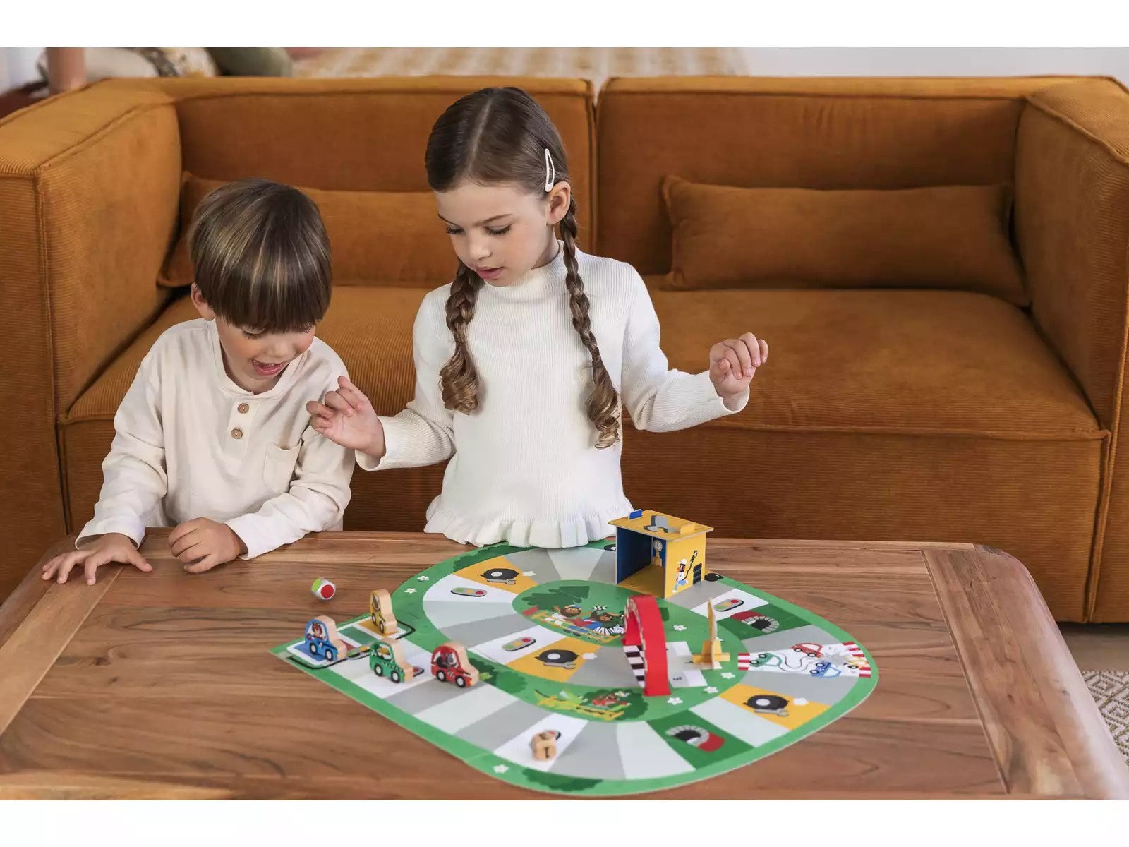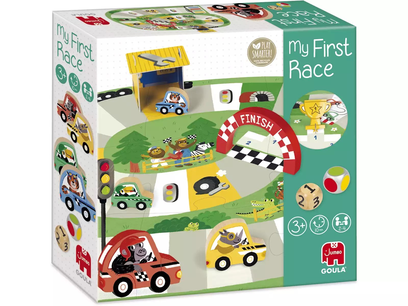 Inclui 1 tabuleiro de jogo com ilustrações, uma oficina 3D, um arco, 4 peões de madeira, 1 taça e 2 dados de madeira.
