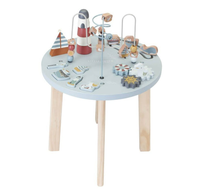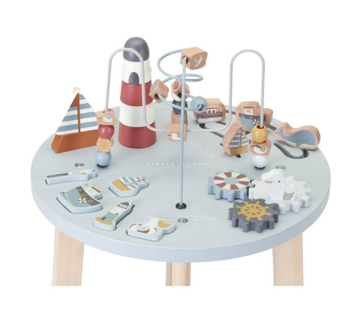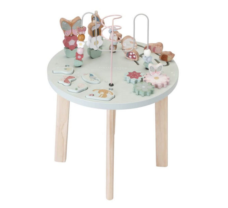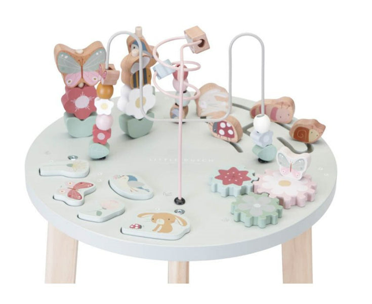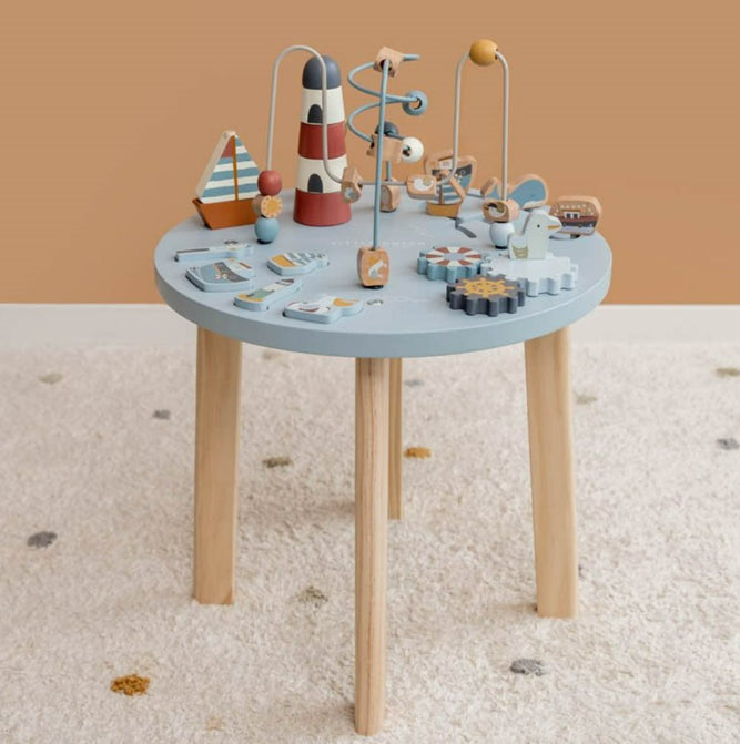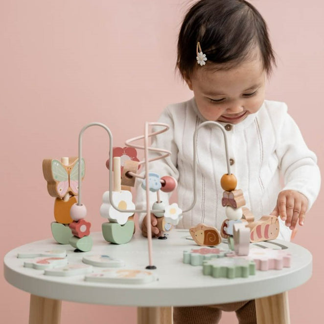 Esta mesa de atividades desafia o seu filho de várias formas.