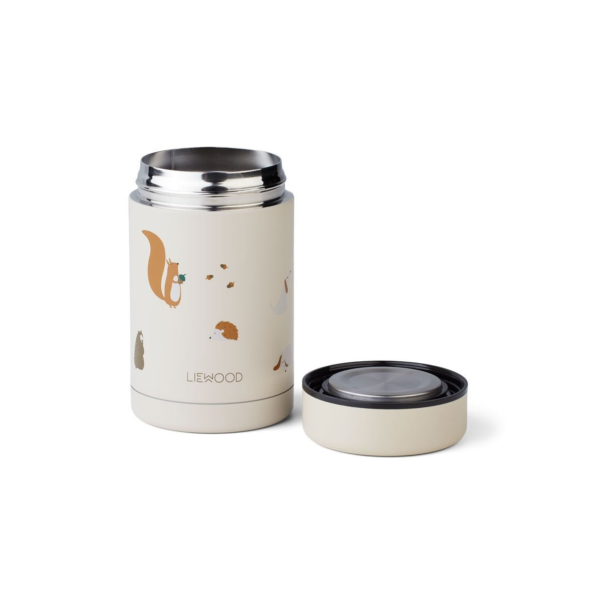 Frasco térmico para transportar alimentos feito em aço inoxidável de parede dupla.