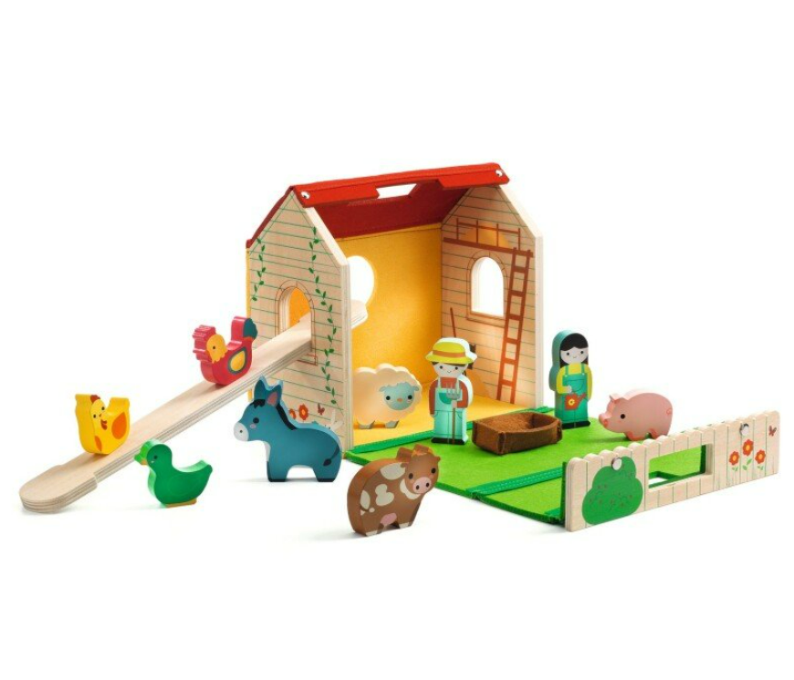 A primeira quinta de brincar portátil feita de feltro grosso e madeira. Abra a quinta para revelar um galinheiro e um celeiro no interior, e um grande campo no exterior para todos os animais. Deslize a tábua para fora do galinheiro para a transformar num escorrega para todas as personagens.Quando terminar, guarde todos os acessórios na quinta e transporte-a facilmente com a sua pega.