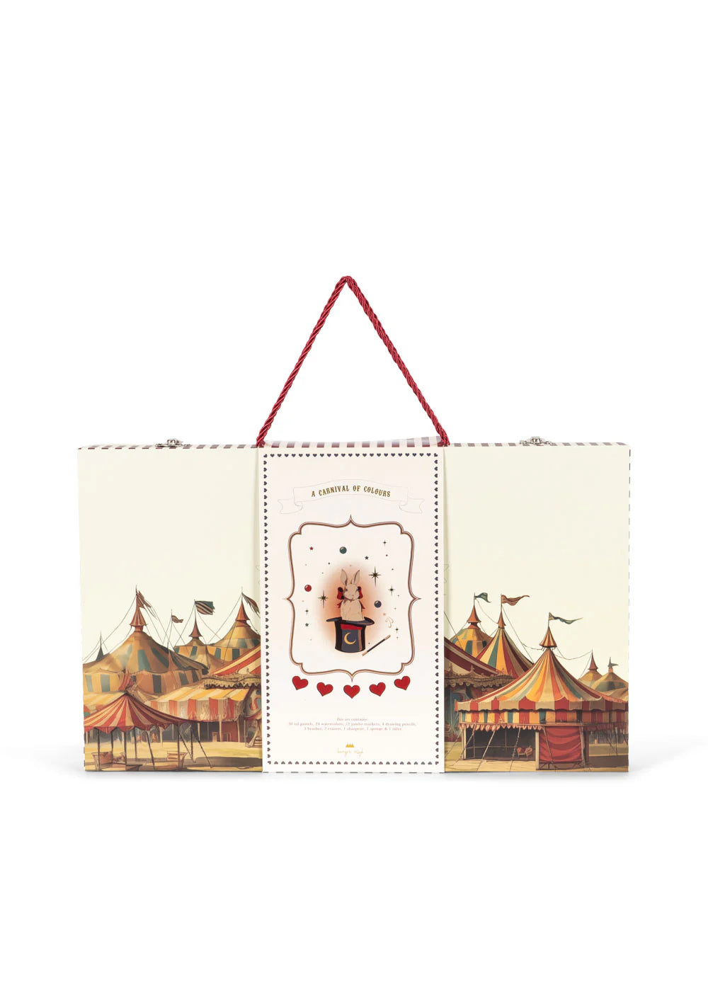 O conjunto inclui 102 elementos no total: 30 pastéis de óleo; 24 tintas aguarela; 24 lápis de cor; 12 marcadores; 4 lápis de desenho; 3 pincéis; 2 borrachas; 1 afia; 1 esponja e 1 régua.