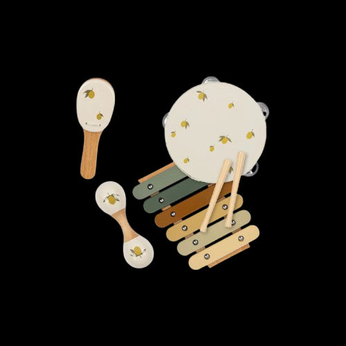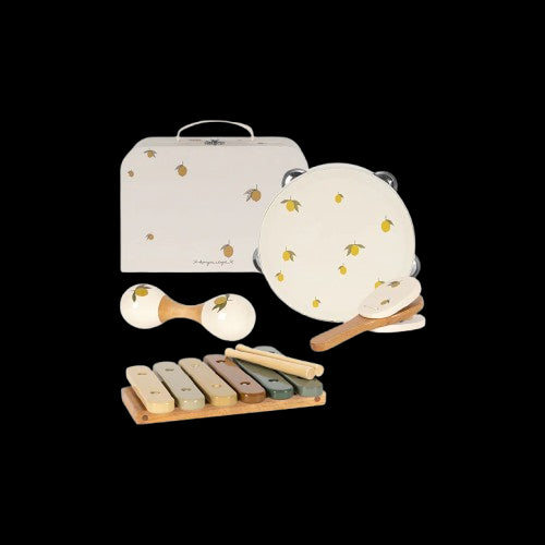 Contém: xilofone, duas baquetas, maracas, castanholas, e pandeireta;
